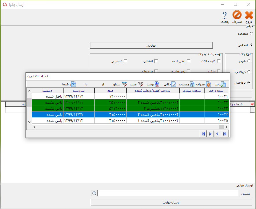 در صورتی که بخواهید چکها را به صورت انتخابی از لیست چکها انتخاب کنید، پارامتر انتخابی را فعال سپس بر روی دکمه انتخابی کلیک کنید.