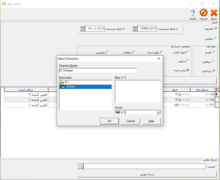 جهت ارسال نهایی چکها در قسمت مسیر، مسیر مورد نظر جهت ذخیره شدن فایل چکها را انتخاب کنيد.