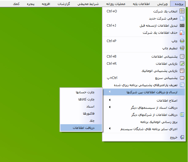 یکی از امکانات کاربردی نرم افزار حسابگر نسخه 9 و بالاتر امکان ارسال و دریافت اطلاعات بین شرکتها است. با استفاده از این امکان میتوانید اطلاعات مربوط به حسابها، کالاها، اسناد، فاکتورها و چکهای یک شرکت را ارسال و آنها را در یک شرکت دیگر دریافت نمایید.