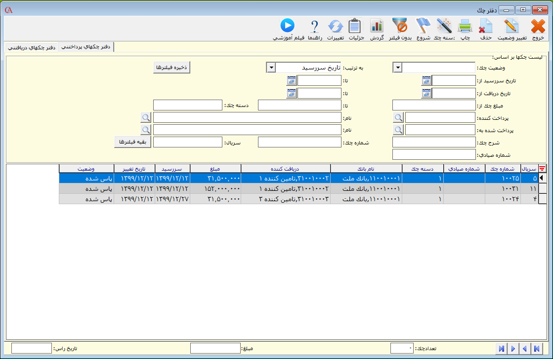 بعد از دریافت چکها جهت مشاهده میتوانید از مسیر عملیات روزانه > دفتر چک اقدام کنید.