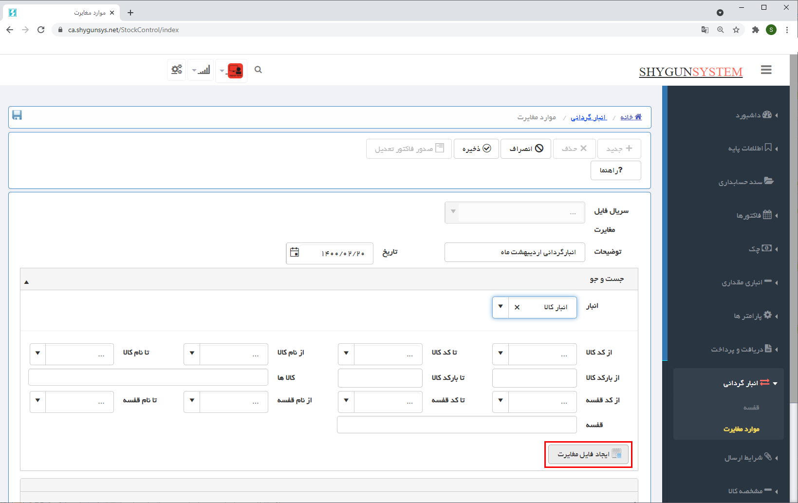 برای صدور انبارگردانی جدید، بر روی دکمه جدید کلیک کنید. در فرم باز شده در قسمت توضیحات، میتوانید شرح انبارگردانی و در قسمت تاریخ، تاریخ انبارگردانی را وارد کنید. در قسمت انبار، انبار مورد نظر جهت انبارگردانی را از لیست انبارها انتخاب کنید. با استفاده از فیلترهای موجود میتوانید کالاها را محدود کنید. بعد از تعیین موارد مورد نظر برای ایجاد فایل مغایرت بر روی دکمه "ایجاد فایل مغایرت" کلیک کنید.