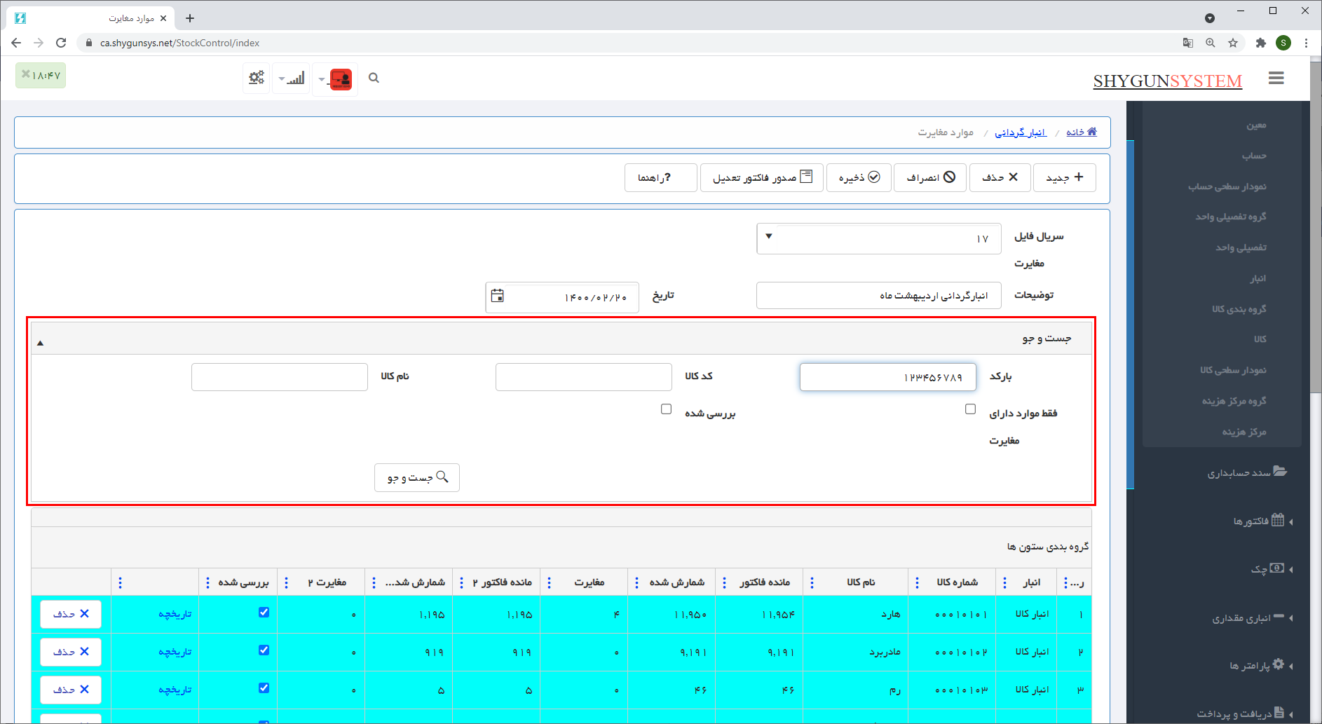 در جدول انبارگردانی، لیست کالاها به همراه موجودی آنها نمایش داده میشود. در ستون مانده فاکتور، مانده کالا در سیستم نمایش داده میشود. در ستون شمارششده، مقدار شمارش شده کالا را وارد کنید. در ستون مغایرت، مقدار تفاوت کالا نمایش داده میشود. در ستون مانده فاکتور۲، مانده واحد شمارش ۲ کالا در سیستم نمایش داده میشود. در ستون شمارششده۲، میتوانید مقدار شمارش شده واحد ۲ کالا را وارد کنید. در ستون مغایرت۲، مقدار تفاوت کالا بر اساس واحد شمارش ۲ کالا نمایش داده میشود. برای کالاهای بررسی شده میتوانید تیک ستون بررسیشده را فعال کنید. با کلیک بر روی دکمه "تاریخچه" میتوانید تاریخچه مربوط به هر ردیف کالا را مشاهده نمایید همچنین با کلیک بر روی دکمه "حذف" میتوانید ردیف جاری را حذف نمایید.