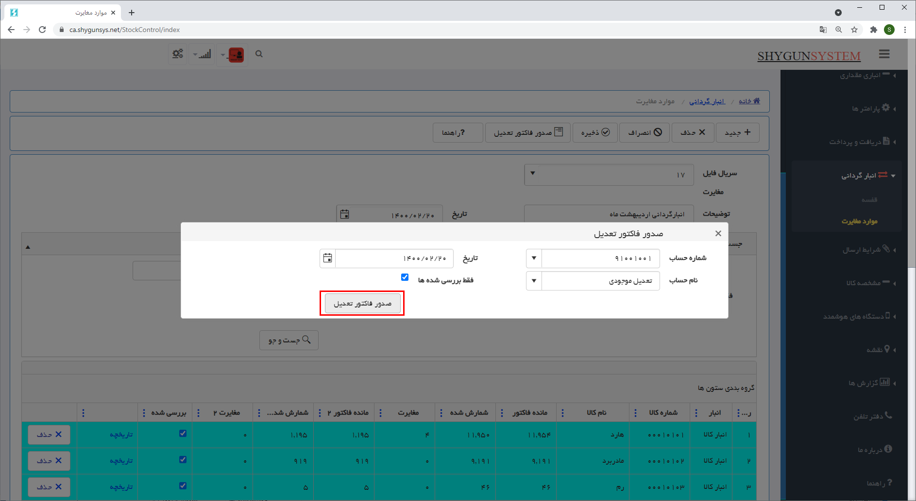 در فرم باز شده در قسمت تاریخ، تاریخ فاکتور تعدیل را وارد کنید. در قسمت شماره یا نام حساب، شماره یا نام حساب مورد نظر را انتخاب کنید. در صورتی که تیک فقط بررسی شدهها را فعال کنید، فاکتور فقط برای ردیفهایی که در انبارگردانی تیک بررسی شده آنها فعال شده باشد صادر میشود. بعد از تعیین موارد مورد نظر بر روی دکمه "صدور فاکتور تعدیل" کلیک کنید.