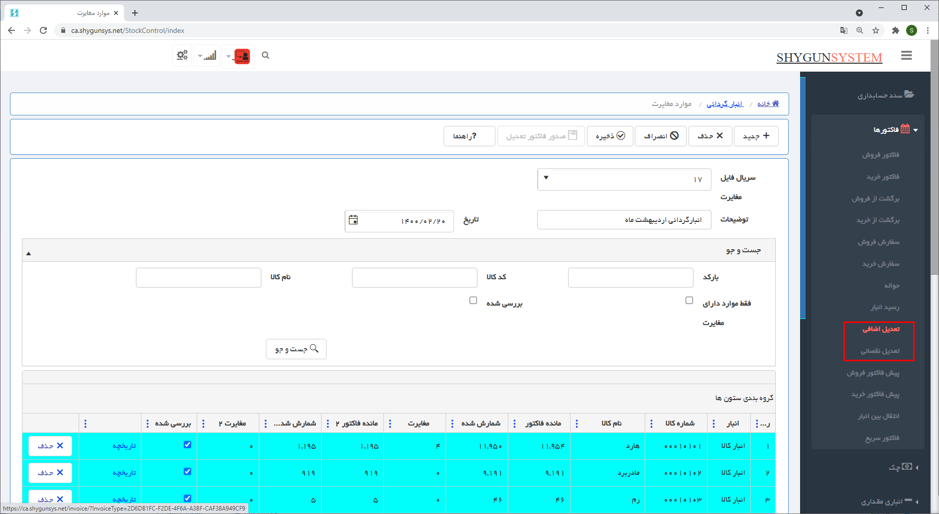 فاکتورهای تعدیل صادر شده بعد از انبارگردانی در سایبروب (Cyber Web) در مسیر فاکتورها > تعدیل نقصانی و تعدیل اضافی قابل دسترسی میباشند. توجه داشته باشید که تعدیل اضافی و نقصانی را میتوانید به صورت دستی نیز ثبت نمایید.