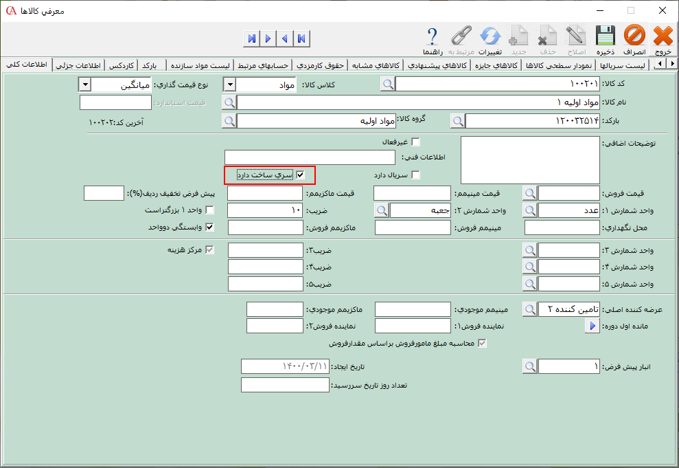 توجه داشته باشید که برای استفاده از امکان سریساخت برای کالاها ابتدا باید برای کالاهای دارای سریساخت در فرم معرفی کالا در زبانه اطلاعات کلی، تیک مربوط به پارامتر «سری ساخت دارد» را فعال نمایید.