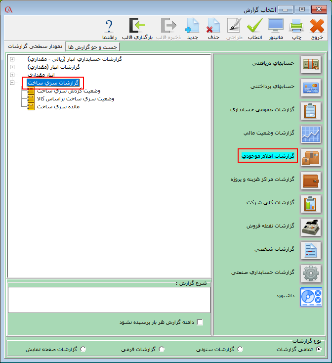 برای تهیه گزارشات مربوط به سریساخت از مسیر گزارشات > گزارشات اقلام موجودی را انتخاب کنید و در فرم باز شده از گزارشات مربوط به بخش سریساخت استفاده نمایید.