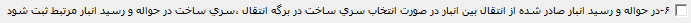 6- در حواله و رسید انبار صادر شده از انتقال بین انبار در صورت انتخاب سریساخت در برگه انتقال، سریساخت در حواله و رسید انبار مرتبط ثبت شود: در صورت فعال بون این پارامتر چنانچه در برگه انتقال بین انبار از سریساخت استفاده شود در رسید و حواله مرتبط به صورت اتوماتیک سریساخت ثبت میشود.