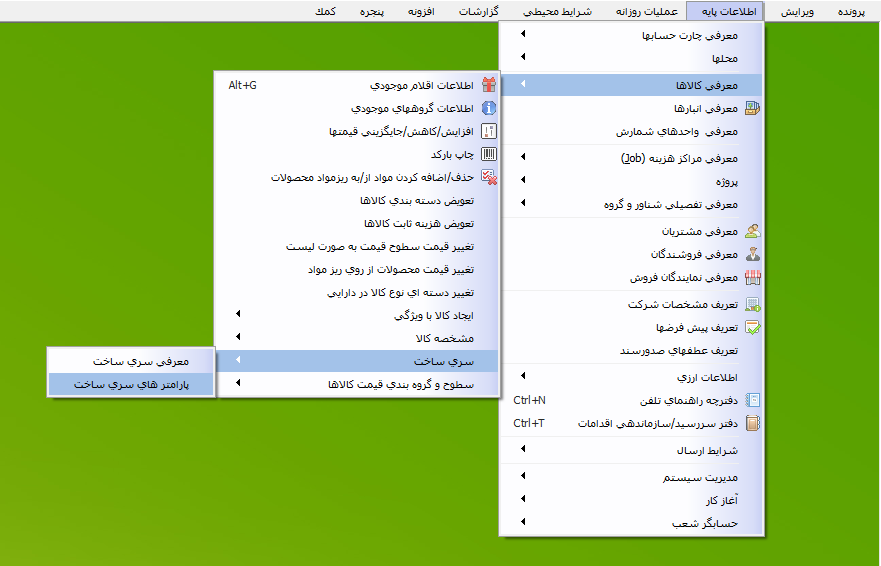 نحوه اختصاص سریساخت به کالا در انواع فاکتور مانند توضیحات داده شده است. جهت تنظیمات مربوط به سریساخت از منوی اطلاعات پایه> معرفی کالا > سری ساخت > پارامترهای سریساخت را انتخاب کنید.