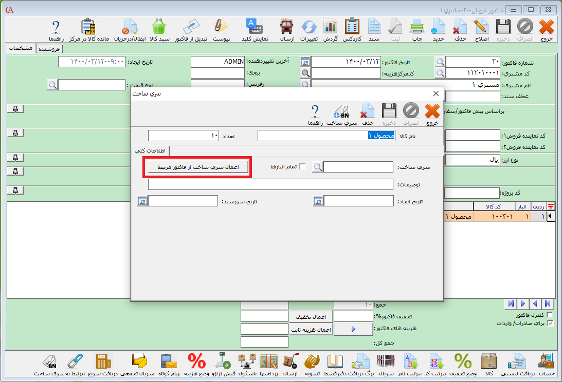برای اختصاص سریساخت به کالاها در فرم فاکتور ردیف کالای مورد نظر را انتخاب سپس بر روی دکمه سری ساخت کلیک کنید.
