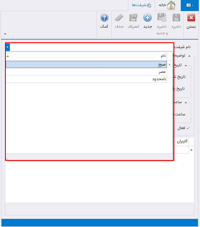 در فرم باز شده در لیست کشویی نام شیفت میتوانید شیفتهای معرفی شده را مشاهده کنید.