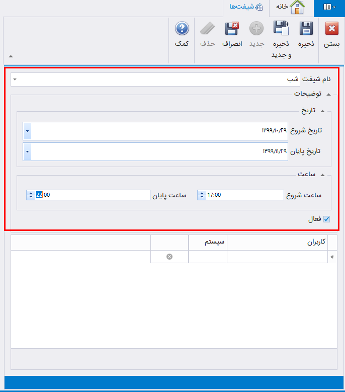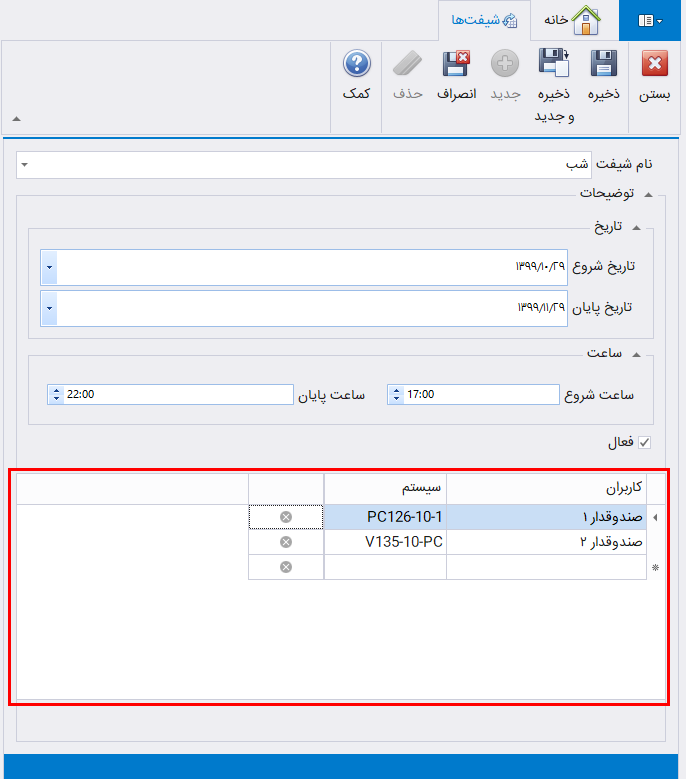 در جدول پایین این فرم، در ستون کاربران، میتوانید مشخص کنید که کدام کاربر از چه سیستمی اجازه استفاده از این شیفت را دارد. برای این کار در جدول کاربران، در ستون کاربران، نام کاربر و در ستون سیستم، نام سیستم را وارد کنید سپس بر روی دکمه ذخیره کلیک کنید.