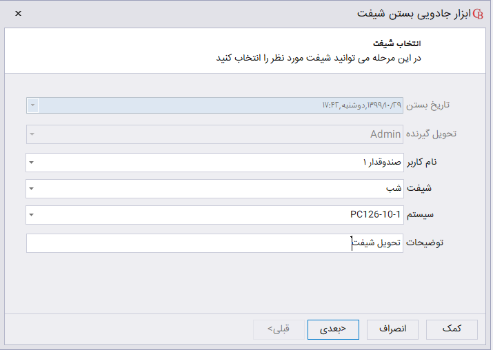 در فرم باز شده در قسمت تاریخ و تحویل گیرنده، تاریخ و نام تحویل گیرنده شیفت نمایش داده میشود. در قسمت نام کاربر، نام کاربری که میخواهید شیفت آن را ببندید انتخاب کنید. در قسمت شیفت، شیفت کاری و در قسمت سیستم، سیستم کاربر را انتخاب کنید. در قسمت توضیحات میتوانید توضیحات مرتبط با بستن شیفت را وارد کنید سپس بر روی دکمه بعدی کلیک کنید.