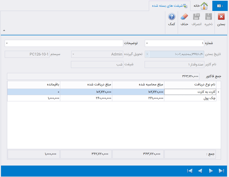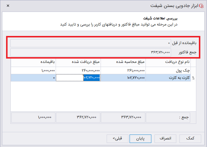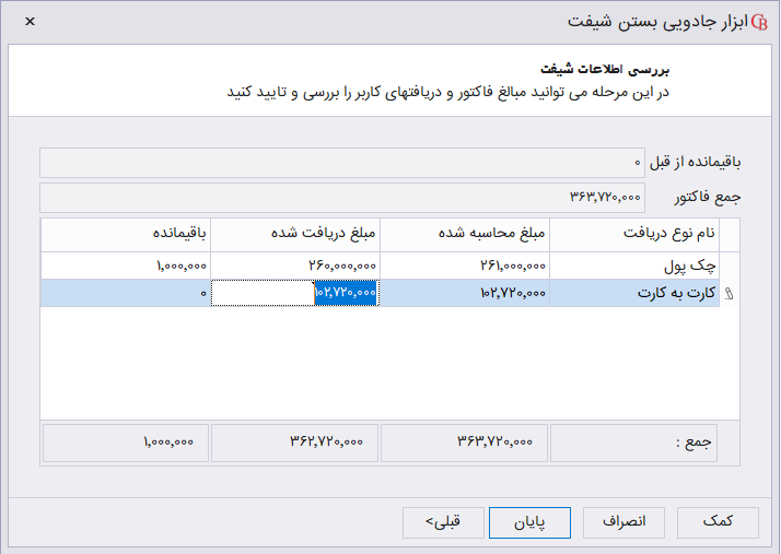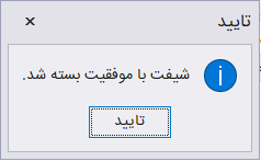 بعد از ثبت دریافتیها از کاربر بر روی دکمه پایان دکمه کلیک کنید تا شیفت انتخاب شده با توجه به اطلاعات وارد شده بسته شود.