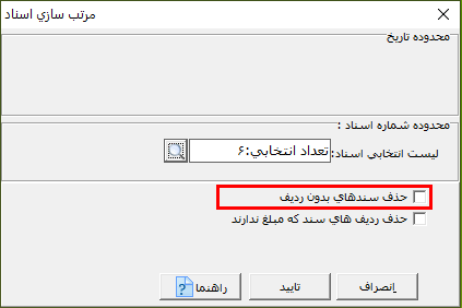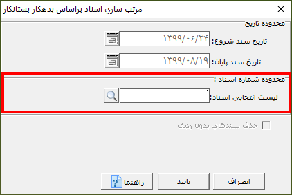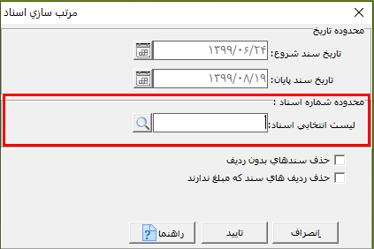 نکته: در صورتی که در قسمت محدوده اسناد، سندی را انتخاب نکنید، همه اسناد انتخاب میشوند. در صورتی که پارامتر "حذف سندهای بدون ردیف" را فعال کنید، سندهای خالی از ليست اسناد حذف میشوند.
