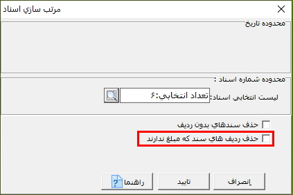 در صورتی که پارامتر "حذف ردیفهای سند که مبلغ ندارند" را فعال کنید، ردیفهای موجود در اسناد که بدون مبلغ هستند، حذف میشوند.