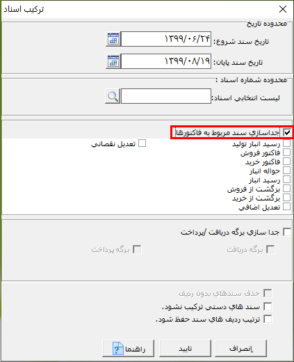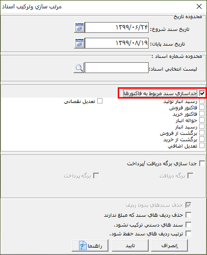در صورتی که پارامتر "جداسازی سند مربوط به فاکتورها" را فعال کنید، سندهای فاکتوری یک روز در یک سند و دیگر اسناد در سند دیگر ترکیب میشوند.