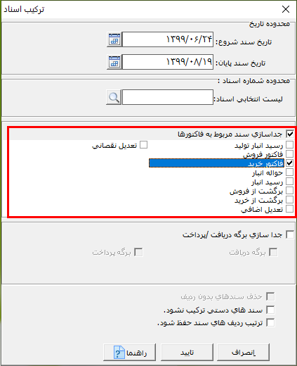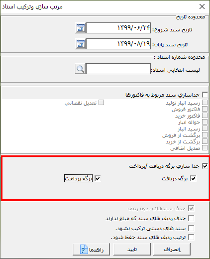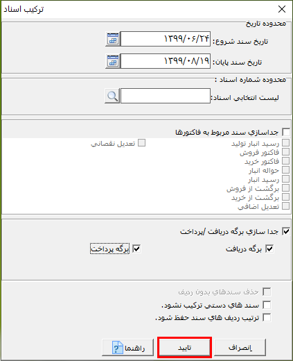در پنجره باز شده در قسمت محدوده تاریخ یا محدوده شماره اسناد، میتوانید انتخاب اسناد را محدود کنید. نکته: در صورتی که در قسمت محدوده اسناد، سندی را انتخاب نکنید، همه اسناد ترکیب میشوند.