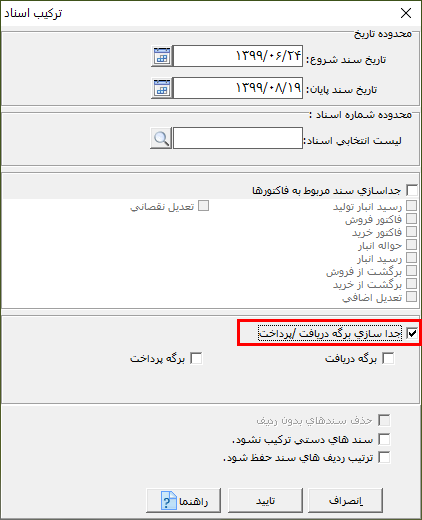 در صورتی که پارامتر "جداسازی برگه دریافت/پرداخت" را فعال کنید، سندهای مرتبط به برگه دريافت و پرداخت یک روز در یک سند و دیگر اسناد در سند دیگر ترکیب میشوند.