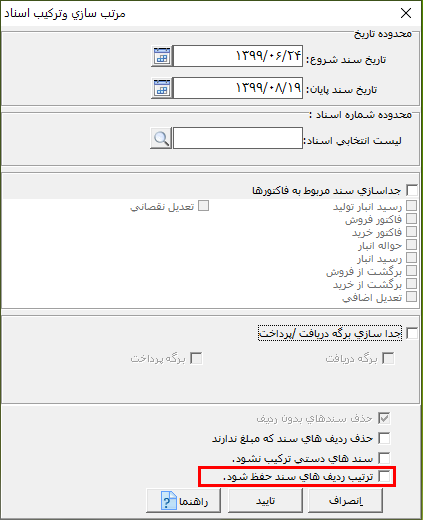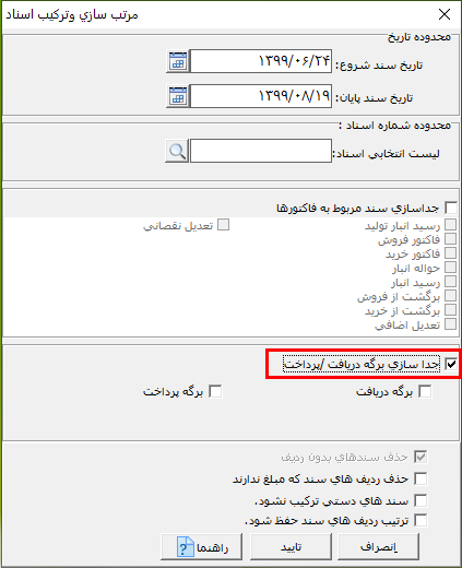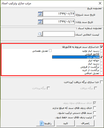 در پنجره باز شده در قسمت محدوده تاریخ یا محدوده شماره اسناد، میتوانید انتخاب اسناد را محدود کنید. نکته: در صورتی که در قسمت محدوده اسناد، سندی را انتخاب نکنید، همه اسناد ترکیب و مرتب سازی میشوند.