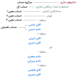 به عنوان مثال مجموعهای را در نظر بگیرید که بدهکاران تجاری (مشتریان) آن در استانهای مختلف هستند و میخواهید اطلاعات مربوط به مشتریان را بر اساس استانها دستهبندی نمایید. گروهبندی حسابها در این مجموعه به این صورت است که حساب سرگروه به نام "داراییهای جاری"، حساب کل مربوط به این سرگروه به نام "حسابها و اسناد دریافتنی تجاری" که این حساب دارای دو حساب معین به نامهای "بدهکاران تجاری تهران" و بدهکاران تجاری قم" و هر حساب معین دارای حسابهای تفصیلی به شرح عکس زیر است.