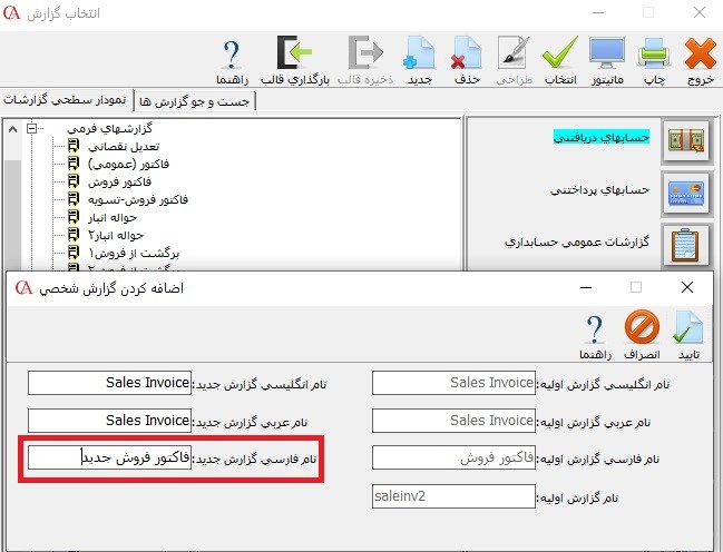 مرحله سوم: پس از انتخاب گزارش، در نوار ابزار بالای گزارشات بر روی دکمه جدید کلیک کرده و در قسمت نام فارسی گزارش یک نام جدید برای گزارش خود انتخاب کرده و بر روی تایید کلیک نمایید.