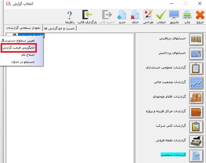 مرحله چهارم: در این مرحله وارد گزارشات شخصی شده و بر روی فرم ساخته شده کلیک راست کرده و گزینه"جایگزینی فرمت گزارش" را انتخاب نمایید و فرمت ارسالی توسط شایگان سیستم را در این قسمت درج نمایید.
