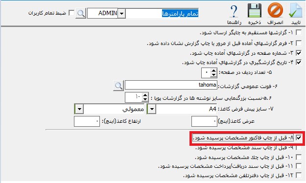 برای مثال در صورتی که گزارش شخصی شما فاکتور است در پارامتر های گزارشات شماره 8 را فعال نمایید.