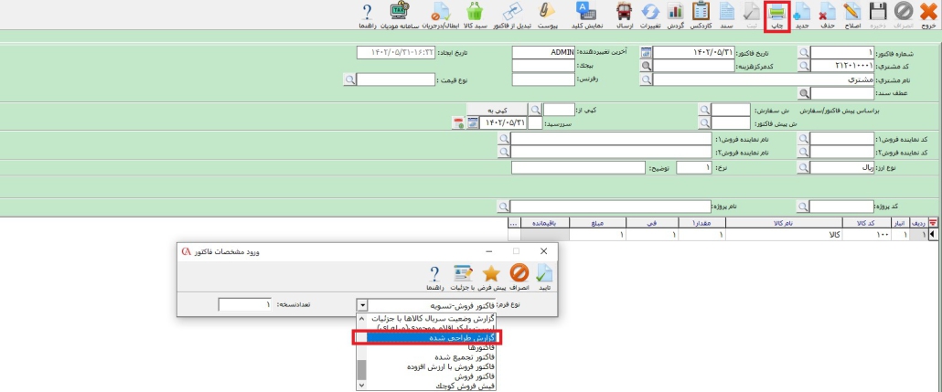 سپس وارد فاکتور شده و گزینه چاپ را زده و در قسمت نوع فرم، گزارش طراحی شده مورد نظر را انتخاب نمایید و از گزارش خود را چاپ بگیرید.