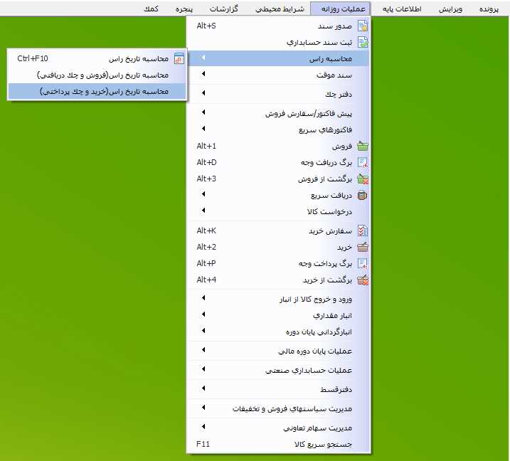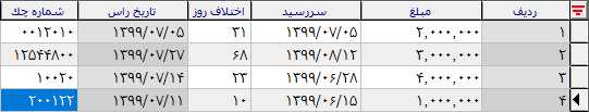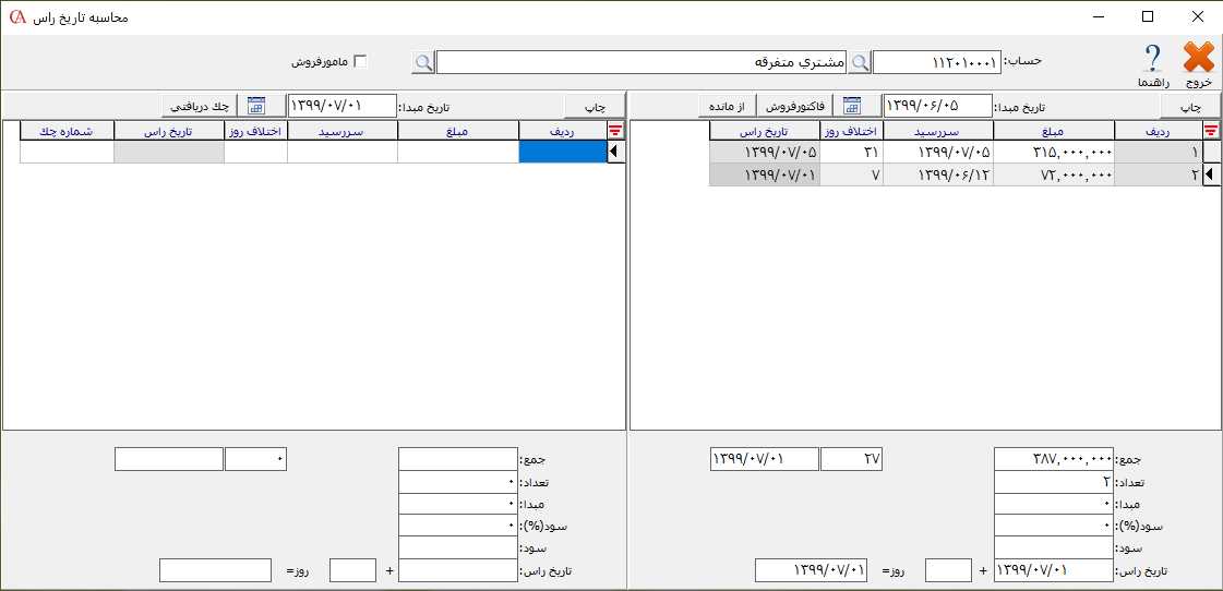 بنابراین تعداد روز راس برای چک‌ها 36.8 روز که می‌توان 37 روز آن را در نظر گرفت و تاریخ راس با توجه به تاریخ مبدا 1399/07/11 می‌باشد. در نرم‌افزار حسابگر می‌توانید به دو صورت دستی و اتوماتیک اقدام به راس گیری نمایید که در ادامه هر دو روش توضیح داده می‌شود. راس گیری به صورت دستی برای ورود مبالغ به صورت دستی و محاسبه تاریخ راس، از منوی عملیات روزانه > محاسبه راس > محاسبه تاریخ راس را انتخاب یا از ترکیب کلیدهای Ctrl+F10 استفاده نمایید. مسير انتخاب فرم محاسبه تاريخ راس در حسابگر در فرم باز شده در قسمت تاریخ مبدا، تاریخی که می‌خواهید در راس‌گیری، اختلاف روز بر اساس این تاریخ محاسبه شود را انتخاب کنید. برای ثبت مبالغ یک ردیف جدید ایجاد کنید. در ستون‌ مبلغ، مبلغ مورد نظر را وارد و در ستون سررسید، تاریخ سررسید مربوط به ردیف را انتخاب نمایید. در ستون اختلاف روز، اختلاف روز سررسید ردیف با توجه به تاریخ مبدا و در ستون تاریخ راس، تاریخ راس نمایش داده می‌شود. در آیتم‌های پایین صفحه نیز می‌توانید مبلغ یا درصد سود را وارد کنید. برای مثال ذکر شده پس از وارد کردن اطلاعات چک، محاسبه راس انجام می‌شود. فرم محاسبه تاريخ راس در حسابگرمحاسبه تاریخ راس (فروش و چک دریافتنی) به صورت اتوماتیک در نرم افزار حسابگر می‌توانید تاریخ راس فاکتورهای فروش و چک‌های دریافتی را محاسبه کنید. جهت محاسبه  تاریخ راس فاکتورها و چک‌های دریافتنی مشتری از مسیر عملیات روزانه > محاسبه راس > محاسبه تاریخ راس (فروش و چک دریافتنی) را انتخاب کنید.مسیر انتخاب فرم محاسبه تاريخ راس فروش و چک دريافتی در حسابگردر فرم باز شده در قسمت حساب، بر روی دکمه ذره‌بین کلیک کنید و حساب مورد نظر را از لیست حساب‌ها انتخاب کنید. چنانچه حساب مورد نظر، حساب مامور فروش باشد تیک مربوط به پارامتر "مامور فروش" را فعال کنید. در قسمت تاریخ مبدا، تاریخ مبدا را انتخاب کنید. با انتخاب دکمه فاکتور فروش، لیست فاکتورهای فروش مربوط به طرف حساب انتخاب شده نمایش داده می‌شود که با استفاده از کلید Insert می‌توانید فاکتورهای مورد نظر را انتخاب و همچنین برای انتخاب کلیه فاکتورها، از ترکیب کلیدهای Ctrl+Insert استفاده نمایید. انتخاب فاکتور در محاسبه راس فاکتور در حسابگربا انتخاب دکمه از مانده، سیستم فاکتورهای فروش صادر شده به نام مشتری را با توجه به مانده حساب مشتری نمایش می‌دهد. به عنوان مثال فرض کنید برای مشتری دو فاکتور با مبالغ 10/000/000 و 25/000/000 صادر و از مشتری مبلغ 10/000/000 دریافت نموده‌اید. در این حالت سیستم فاکتور اول مشتری را تسویه در نظر می‌گیرد و یک ردیف با اطلاعات مربوط به فاکتور فروش دوم با مبلغ 25/000/000 نمایش داده می‌شود. فرم محاسبه راس فاکتور با مانده در حسابگربعد از انتخاب فاکتورها، تعداد روز و تاریخ راس نمایش داده می‌شود. نکته: تاریخ راس محاسبه شده به صورت اتوماتیک به عنوان تاریخ مبدا برای چک‌های دریافتنی در نظر گرفته می‌شود که قابل تغییر است. با انتخاب دکمه چک دریافتنی، لیست چک‌های دریافتنی مربوط به طرف حساب انتخاب شده، نمایش داده می‌شود که با استفاده از کلید Insert می‌توانید چک‌های دریافتنی مورد نظر را انتخاب و همچنین برای انتخاب کلیه چک‌های دریافتنی، از ترکیب کلیدهای Ctrl+Insert استفاده نمایید. محاسبه تاريخ راس چک دريافتني در حسابگر بعد از انتخاب چک‌های دریافتنی تعداد روز و تاریخ راس نمایش داده می‌شود. محاسبه تاريخ راس چک دریافتنی در حسابگربه عنوان مثال فرض کنید شما 2 فاکتور فروش با تاریخ سررسیدهای مختلف برای یک مشتری صادر نموده‌اید و با مشتری شرط کرده‌اید که نهایتا تا 30 روز بعد از تاریخ راس فاکتورها بدهی خود را تسویه نماید. مشتری قصد دارد جهت تسویه بدهی خود 5 چک با مبالغ و تاریخ سررسیدهای مختلف به شما ‌دهد. با محاسبه راس فاکتورها و چک‌ها می‌توانید کنترل کنید که سررسید چک‌های ارائه شده مشتری از 30 روز بیشتر نمی‌شود. همانطور که در عکس زیر مشاهده می‌کنید، تاریخ سر
