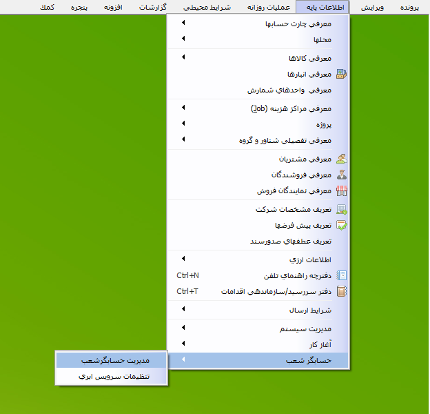 برای تعیین تنظیمات مربوط به شعبه در برنامه حسابگر از منوی اطلاعات پایه > مدیریت حسابگر شعب را انتخاب کنید.