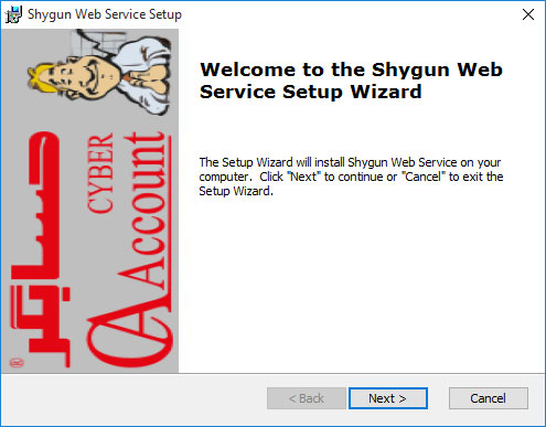 برای راه اندازی حسابگر شعب ابتدا لازم است که وب سرویس را نصب کنید. برای نصب وبسرویس در DVD برنامه از مسیر Web Service ADDIN > فایل ShygunWebService.exe را اجرا کنید. در فرم باز شده بر روی دکمه Next کلیک کنید.