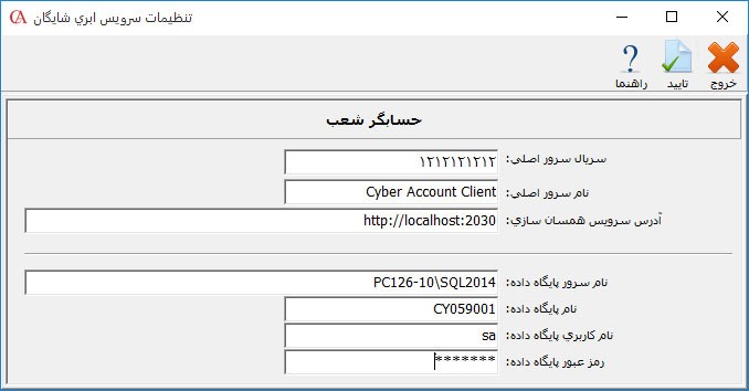 برای انجام تنظیمات سرویس ابری شایگان در فرم اصلی برنامه حسابگر از مسیر اطلاعات پایه > حسابگر شعب > تنظیمات سرویس ابری را انتخاب کنید. در فرم باز شده در قسمت سریال سرور اصلی، سریال سرور اصلی که از شرکت شایگان سیستم دریافت کردهاید را وارد کنید. در قسمت نام سرور اصلی، نام سرور و در قسمت آدرس سرویس همسانسازی، آدرس سرویس همسان ساز را وارد کنید. در قسمت نام سرور پایگاه داده، نام پایگاه داده، نام کاربری پایگاه داده و رمز عبور پایگاه داده، اطلاعات مربوط به پایگاه داده را وارد کنید سپس بر روی دکمه تایید کلیک کنید. توجه داشته باشید به صورت پیشفرض قسمتهای نام سرور اصلی، آدرس سرویس همسان سازی، نام سرور پایگاه داده و نام پایگاه داده توسط سیستم تعیین میشود.
