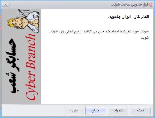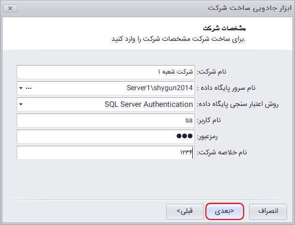 در مرحله بعد اطلاعات شرکت را وارد کنید. در قسمت نام شرکت، نام شرکت را وارد کنید. در قسمت نام سرور پایگاه داده، نام سرور پایگاه دادده را انتخاب یا وارد کنید. در قسمت روش اعتبار سنجی پایگاه داده، نحوه اتصال برنامه به Sql Server را مشخص کنید. در صورتی که گزینه «Windows Authentication» را انتخاب کنید، اتصال شما به برنامه Sql Server از طریق User لاگین شده در سیستم عامل فعلی خواهد بود. همچنین در صورتی که گزینه «SQL Server Authentication» را انتخاب کنید، در قسمت نام کاربری و رمز عبور، نام کاربری و رمز عبور پایگاه داده را وارد کنید. در قسمت نام خلاصه شرکت، یک نام 4 حرفی برای شرکت وارد کنید. برنامه بر اساس این نام در پایگاه داده یک شرکت ایجاد میکند. سپس دکمه بعدی را فشار دهید. چنانچه از برنامه حسابگر شعب به صورت شبکه استفاده میکنید، پیشنهاد میشود که در قسمت روش اعتبار سنجی پایگاه داده، گزینه «SQL Server Authentication» را انتخاب کنید. در صورتی که اطلاعات وارد شده در این مرحله صحیح باشد یک شرکت ایجاد میشود.