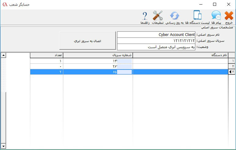 در فرم باز شده میتوانید لیست سریال شعبههای مرتبط به برنامه حسابگر را مشاهده نمایید. نکته: با استفاده از دکمه «اتصال به سرور ابری» میتوانید اتصال کامپیوتر به سرورهای ابری شرکت شایگان سیستم را بررسی کنید. برای تعیین تنظیمات مربوط به شعبه، سریال مورد نظر را انتخاب و سپس بر روی دکمه تنظیمات موجود در بالای صفحه کلیک کنید.
