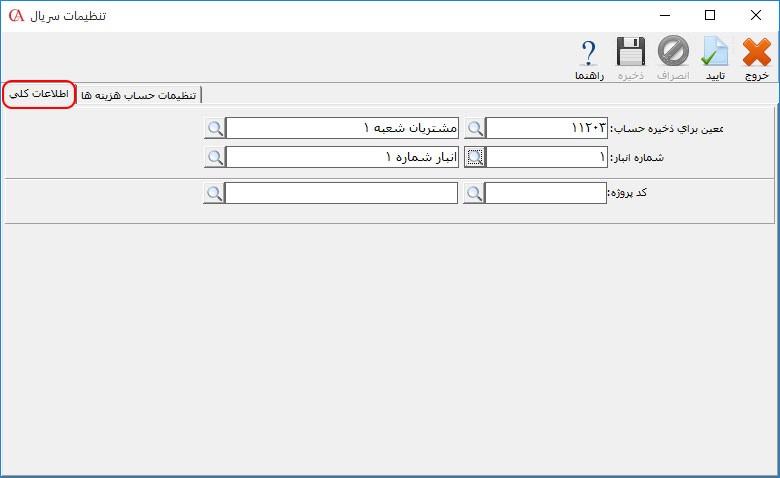 در فرم باز شده در زبانه اطلاعات کلی، در قسمت معین برای ذخیره حساب، شماره یا نام حساب معین برای ارسال و دریافت اطلاعات حساب بین شعبه و برنامه حسابگر را انتخاب کنید. در قسمت شماره انبار، شماره یا نام انبار کالاهای شعبه را انتخاب کنید. در قسمت کد پروژه میتوانید پروژه شعبه را انتخاب کنید.