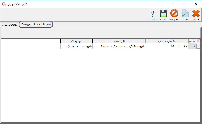 در زبانه تنظیمات حساب هزینهها، میتوانید حسابهای مربوط به هزینه را برای نرمافزار حسابگر شعب تنظیم کنید. برای تعریف حساب هزینه جدید یک سطر جدید ایجاد کنید. در قسمت شماره یا نام حساب، حساب مورد نظر را انتخاب کنید. در قسمت توضیحات، توضیحات مربوط به حساب تعریف شده را وارد کنید. سپس بر روی دکمه تایید کلیک کنید. توجه داشته باشید که در برنامه شعبه، توضیحات وارد شده در ستون توضیحات نمایش داده میشود.