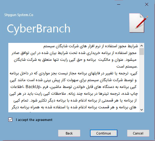 چنانچه شرایط مجوز استفاده از نرمافزارهای شرکت شایگان سیستم را پذیرفتهاید گزینه I accept the agreement را انتخاب کنید و سپس بر روی دکمه Continue کلیک کنید.