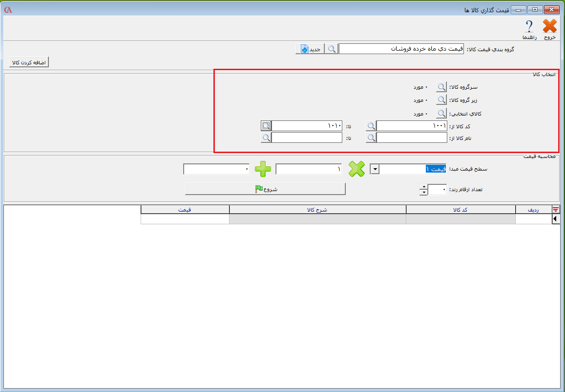 بعد از تعیین موارد بر روی دکمه شروع کلیک کنید. در جدول پایین این فرم، قیمت هر کالا با توجه به محاسبه تعیین شده نمایش داده میشود.