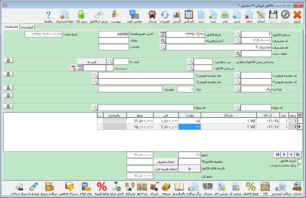 در فرم باز شده در قسمت نوع فاکتور، شماره فاکتور، تاریخ فاکتور، نام کالا، تعداد و واحد 1، اطلاعات مربوط به ردیف فاکتور نمایش داده میشود.