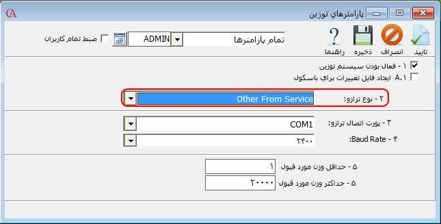 2-2 ترازو برای انجام تنظیمات مربوط به ترازوهایی که نحوه اتصال آنها از طریق سرویس متمرکز شایگان است بعد از نصب سرویس متمرکز شایگان، از مسیر شرایط محیطی > پارامترهای توزين را انتخاب کنید. در فرم باز شده نوع ترازو را بر روی گزینه Other From Service تنظیم کنید. سپس بر روی تایید کلیک کنید.