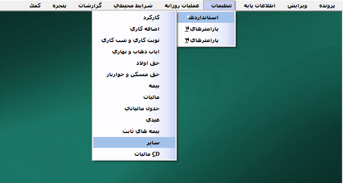 برای تعیین سایر تنظیمات مربوط به حقوق و دستمزد از منوی تنظیمات > استاندارد ها > سایر را انتخاب کنید.