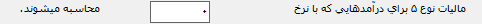 مالیات نوع 5: این نوع مالیات برای درآمدهایی که با یک نرخ ثابت محاسبه میشوند، کاربرد دارد. (درآمدهای اتفاقی، حق تدریس، حق چاپ، حقالزحمه حسابرسی)