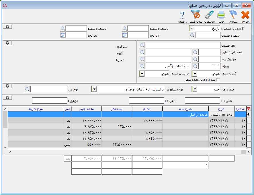 نکته: در حسابگر میتوانید در انواع گزارشات از فیلتر پروژه استفاده نمایید. همچنین میتوانید در گزارش صورت حساب مشتری (shift+1) از این قابلیت برای تفکیک تراکنشهای مالی خود استفاده کنید.