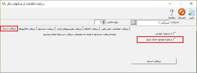 در صورتی که تیک پارامتر "شماره موجود حذف شود" را فعال کنید در هنگام دریافت اطلاعات چنانچه شماره سند دریافتی در شرکت وجود داشته باشد، سند موجود در شرکت مقصد حذف و سند دریافتی جایگزین آن میشود و در صورتی که این پارامتر غیر فعال و در شرکت مقصد شماره سند وجود داشته باشد، سند دریافتی با سند موجود در شرکت مقصد ترکیب میشود.