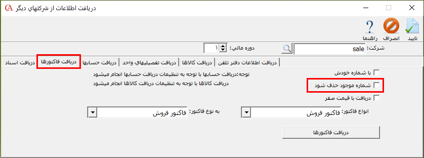 در صورتی که تیک پارامتر "شماره موجود حذف شود" را فعال کنید در هنگام دریافت اطلاعات چنانچه شماره فاکتور دریافتی در شرکت وجود داشته باشد، فاکتور موجود در شرکت مقصد حذف و فاکتور دریافتی جایگزین آن میشود و در صورتی که این پارامتر غیر فعال و در شرکت مقصد شماره فاکتور وجود داشته باشد، فاکتور دریافتی با فاکتور موجود در شرکت مقصد ترکیب میشود.