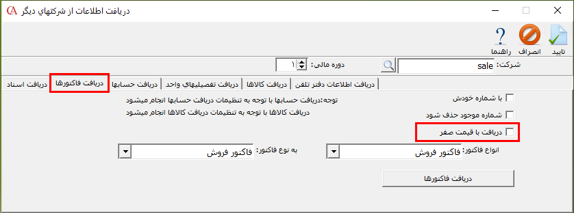 در صورتی که تیک پارامتر "دریافت با قیمت صفر" را فعال کنید، قیمت کالاها در فاکتور شرکت مقصد صفر در نظر گرفته میشود.
