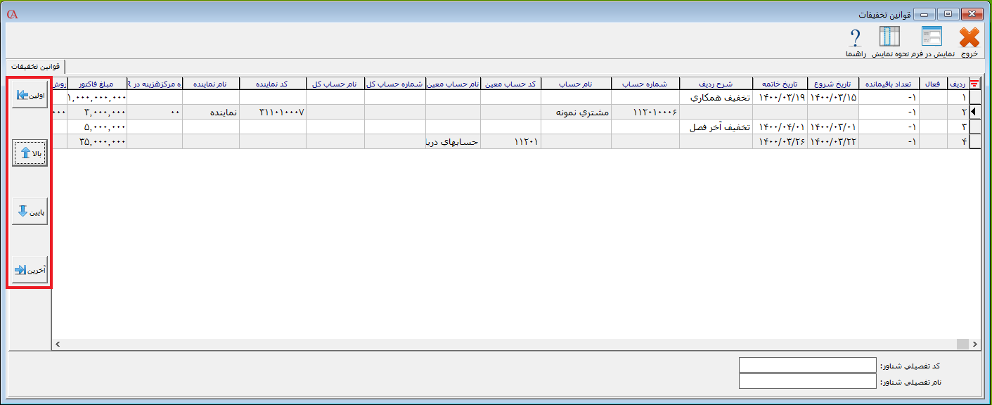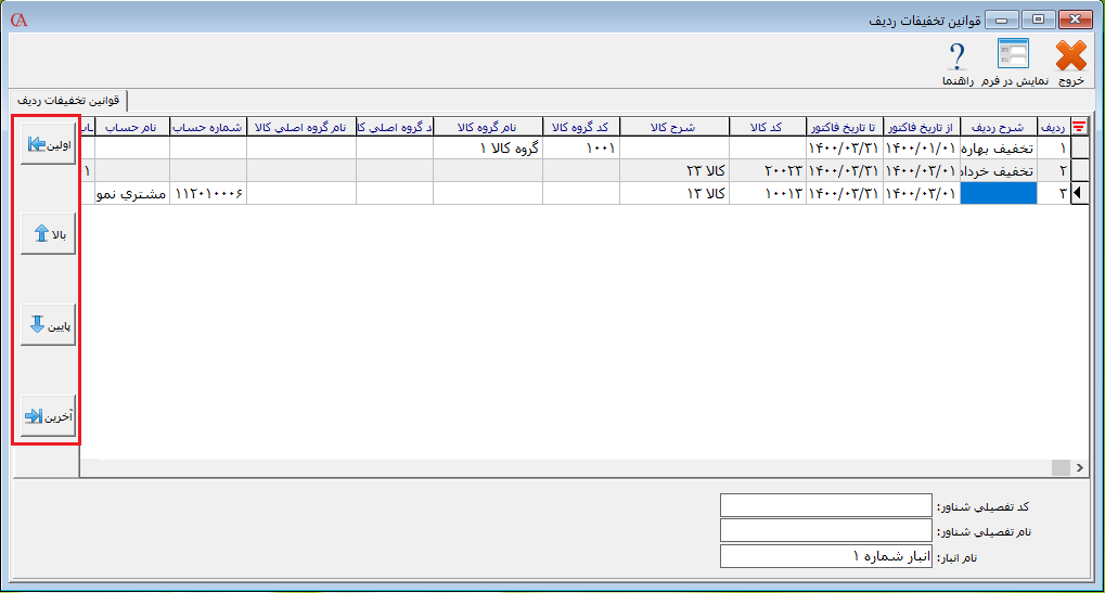 بعد از تعریف قوانین، برای تعیین اولویت و جابجا کردن قوانین تعریف شده میتوانید از دکمه های بالا، پایین، اولین و آخرین موجود در سمت چپ پنجره تعریف قوانین تخفیفات استفاده نمایید.