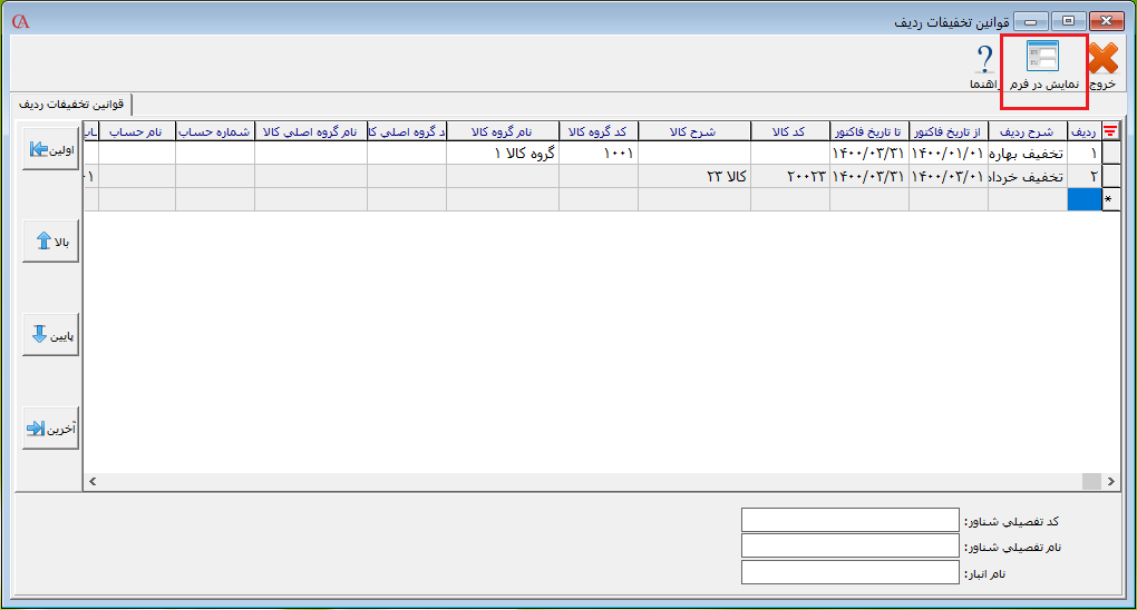 در فرم باز شده قوانین تعریفشده در سیستم نمایش داده میشود. برای تعریف قانون جدید، یک ردیف جدید ایجاد کنید سپس برای سهولت کار بر روی دکمه «نمایش در فرم» کلیک کنید.