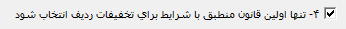 4- تنها اولین قانون منطبق با شرایط برای تخفیفات ردیف انتخاب شود: در صورت فعال بودن اين پارامتر، اگر در قسمت قوانين تخفیفات ردیف کالاها، بيش از يک قانون برای رديف فاکتور صدق کند، فقط قانون اول اعمال میشود. به عنوان مثال فرض کنید دو قانون به شرح زیر وجود دارد: