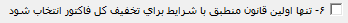 6- تنها اولین قانون منطبق با شرایط برای تخفیف کل فاکتور انتخاب شود: در صورت فعال بودن اين پارامتر، اگر در قسمت قوانين تخفیفات کل فاکتور، بيش از يک قانون برای کل فاکتور صدق کند، فقط قانون اول اعمال میشود. ![]()
